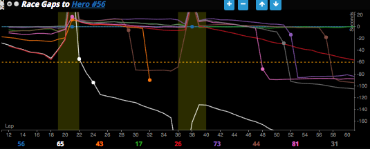 The Race Gapchart assists strategically visualizing the race via a chronological view of time gaps to the Hero car. The X axis tracks the most recent (50) laps and the Y axis displays +/- time gaps.