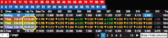 • Faster and Slower arrows show how each working lap's sectors compares with his Best, Rolling, and Theoretical lap's sector times.